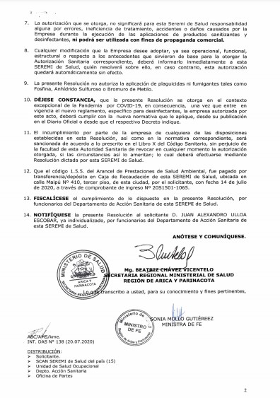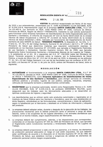 Santa Carolina Ltda. ha recibido la autorización sanitaria para nuestro servicio de sanitización y desinfección, a través de la resolución N ° 733, de la seremía de salud de Arica y Parinacota.